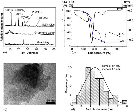 (a) XRD patterns for graphite and graphene oxide compared to the as-synthesized N,Zn-CDs, (b) TGA, DTA, and DTG patterns, (c) TEM image, and (d) particle size distribution of the as-synthesized N,Zn-CDs.