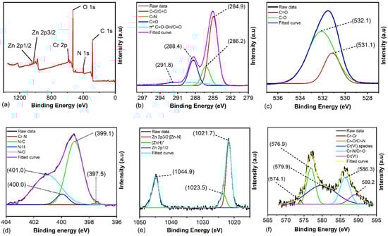XPS spectra of N,Zn-CDs + Cr(VI) system (a) survey spectrum, (b) carbon deconvoluted peaks (C 1s), (c) oxygen deconvoluted peaks (O 1s), (d) nitrogen deconvoluted peaks (N 1s), (e) zinc deconvoluted peaks (Zn 2p), and (f) chromium deconvoluted peaks. * The mixed Cr(VI) species identified within 579 eV are those of Cr(VI)/CrO3, Cr(VI)/CrO42−, and Cr(VI)/Cr2O72− [52].