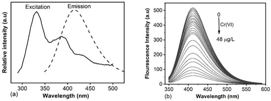 (a) Excitation and emission wavelengths of the synthesized particles and (b) fluorescence quenching spectra of N,Zn-doped fluorescent carbon dots as a function of different concentrations of Cr(VI). Excitation was performed at 330 nm.