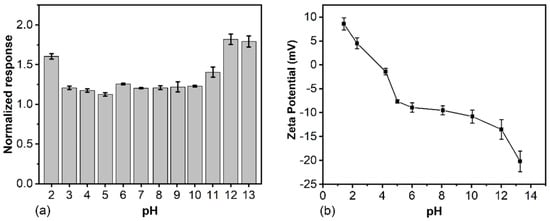 The effect of pH on the fluorescence of the nanomaterial was investigated by adding a negligible amount of 0.1M HCl and/or NaOH to the suspension. Figure 5a shows the effect of pH on the fluorescence intensity of the suspension. The pH ~4.5 was measured in our study when we dissolved the N,Zn-CDs in water and was also used in all other experiments. The solution pH is an important parameter for the sorption process of a sensor because it can affect the surface chemistry of the adsorbent and the species of the impurities of interest [59]. As shown in Figure 5a, the fluorescence intensity of the nanomaterial did not change significantly from ~pH 3 to 10, indicating that the particles were stable in these ranges. However, an increase in fluorescence intensity was observed at pH < 3 or pH > 10. At lower pH values, the surface charge of nanomaterials containing metals is usually positively charged, resulting in H+ ions competing with the available metal ions and subsequently reducing the adsorbed metal [60,61,62]. On the other hand, at higher pH values, the number of anions increases, which allows the exchange of ions by a displacement reaction with -OH, producing NaCl [61]. The same phenomenon is observed when measuring the zeta potential at different pH values, as shown in Figure 5b. At a lower pH, the surface zeta potential of the particles assumes a positive charge, while an increase in pH results in a negative surface zeta potential charge of the particles. Thus, these experiments in aqueous medium show that the nanomaterial has good stability and can function effectively in the pH range of 3–10.