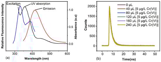 (a) UV-Vis absorption spectra of Cr(VI), fluorescence excitation spectra, and emission spectra of the N,Zn-doped fluorescent carbon dots in aqueous solution and (b) time-resolved decay of the N,Zn-CDs system at different volumes of 5 µg/L Cr(VI) concentrations.