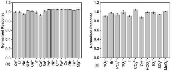 The salt solutions were prepared by dissolving known masses of the ions in 5 mL of water to obtain a 2.0 mmol/L ionic solution. The ionic solutions included Q-ClX (Q = Sn2+, Ca2+, Na+, Li+, Co2+, NH4+, K+, Zn2+, Fe3+, and Cu2+), MgSO4, Pb(NO3)2, Ni(NO3)2·6H2O, CrCl3·6H2O, FeSO4·6H2O, CsNO3, and RbNO3 as cations, and Nax-R (R = NO2−, CO32−, HCO3−, SO42−, OH−, PO43−) and Kx-T (T = Br−, I, IO3−, NO3−, MnO4−) as the anions. Then, 10 µL of the ion solutions were added to the N,Zn-CDs solution (3 mg/5 mL), and the fluorescence intensity was measured at an excitation wavelength of 330 nm. Finally, an equivalent amount, 500 µL of a 10 µg/L Cr(VI) standard solution, was added to 2 mL of the ionic solutions, and the corresponding fluorescence intensity was recorded.