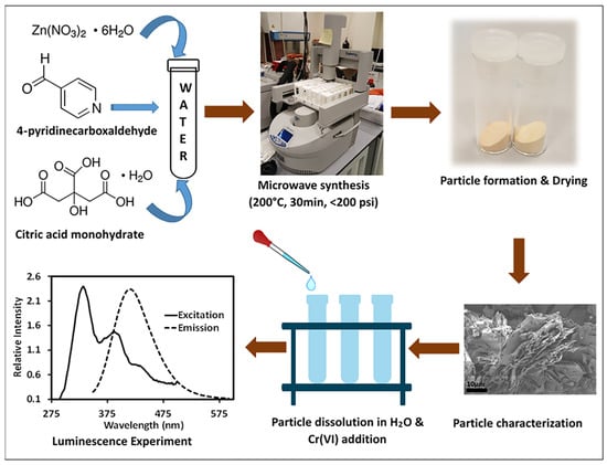 Currently, fluorescence spectroscopy using nanomaterials for real-time monitoring is gaining popularity because it offers distinct advantages such as fast response time, specificity, and sensitive detection [18]. Carbon dots (CDs), a new fluorescent nanomaterial, have attracted attention because of their properties such as good water solubility, variable fluorescence emission, high biocompatibility, good photostability, and low toxicity [18,19,20,21]. These outstanding properties, including their chemical inertness, have made them suitable materials for photocatalysts, energy conversion, sensors, and bioimaging [1,22,23,24,25]. Various synthesis methods for fluorescent CDs have been developed, including arc discharge [26], electrochemical etching [27], laser ablation [28], hydrothermal processes [19], and ultrasonic synthesis [29]. Most of these methods often involve low quantum yield (QY), expensive equipment, and/or complicated professional handling [21]. Alternatively, microwave methods for the fabrication of CDs are gaining attention due to their ease of use, fast synthesis time, simplicity, and low cost [30]. Properties such as the electron transfer capability of CDs enhance their fluorescence properties compared to other carbon-based structures such as carbon nanotubes, carbon nanofibers, and graphene [18,31]. Currently, doping CDs with certain elements plays an important role in changing their band gap energy, which improves the charge separation efficiency of photosensors [31]. Therefore, nitrogen-doped carbon dots (N-CDs) are now an important species in the development of composite sensors. Since zinc has also been identified as insignificantly toxic, its use as a dopant in the CD matrix is beneficial for improving the physicochemical properties of carbon nanomaterials [32]. Additionally, researchers have found that the Zn dopant has relatively negligible toxicity to CDs and can therefore be considered a more environmentally friendly metal atom [32,33]. In the development of doped carbon dot sensors, guest molecules are introduced into the interior of the host carbon material. In this way, the host binds to the selective guest molecules introduced before other competing species and registers the binding event with a unique structural shape [15,16,34]. In this study, we use very simple and commercially available organic ligands (4-pyridinecarboxaldehyde and citric acid monohydrate) in the presence of Zn2+ ions (Scheme 1). Ligand-based fluorescence emissions are usually attributed to particles containing d10 metal ions that do not undergo d-d transitions. Therefore, the presence of zinc metal in the fluorescent carbon dots with mixed ligands can produce this type of ligand-based fluorescence emission [34]. Immobilized Lewis base pyridyl nitrogen sites located on the organic structure exhibit fluorescence properties and can selectively respond to metal ions [34,35]. Techniques such as microwave irradiation [32,36,37,38] and hydrothermal treatment [33] have been reported in the literature for the synthesis of N,Zn CDs, and these CDs have mostly been used as biosensors or for detecting Fe(III). However, there is limited research showing that N,Zn-CDs could serve as fluorescent sensors for detecting Cr(VI) ions.