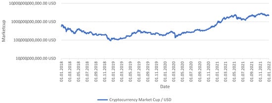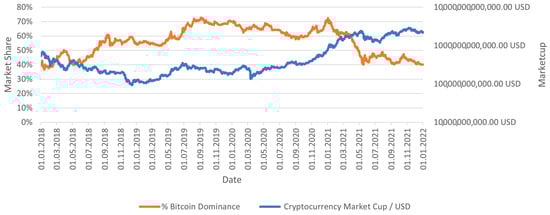 The starting point of the research was selected due to the limited adoption of cryptocurrencies in the previous years (Figure 4); Bitcoin’s high dominance in previous years; the absence of data available for smaller projects in the previous years; the low affiliation of projects in the previous years; and the low importance of the market in the previous years.
