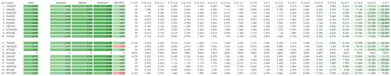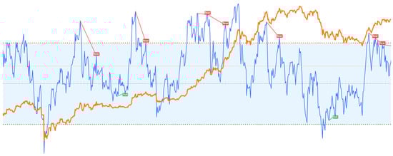 In order to examine the correlation of the studied altcoins with Bitcoins, a program was written in the TradingView platform (Figure 5). The program allowed the examination of the correlation of a length selected by the user. In the experiment, the length of 14 was adopted due to the length of the RSI used. The correlation was studied over the 4 years of the experiment. A total of 1447 records were recorded for each index. The research was conducted daily. To examine the correlation as comprehensively as possible, a factor was created. The factor contained the mean of the average, the median, and the dominant of the collected data for each cryptocurrency. The possible range of the factor varied from −1 to 1. The experiment did not consider Bitcoin or the top five altcoins.