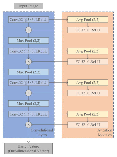 The feature extractor is used for basic feature extraction, i.e., processing SAR images into one-dimensional vectors of length 64. As shown in Figure 2, the feature extractor includes a group of convolutional layers to map the high-dimensional vector to the low-dimensional vector. Several attention modules are interspersed among them to learn the correlation between channels and change the weight of each channel [31]. Through these modules, important information can be enhanced to make the extracted features more directional.