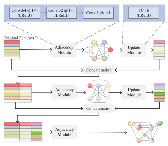 - where represents the update module (contains FC and ReLU layers, the former for tensor deformation and the latter for the nonlinear activation function). is a learned weight parameter. is the matrix of features before the lth iteration, and . Concatenate previous features with learned features as: