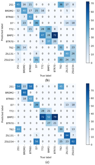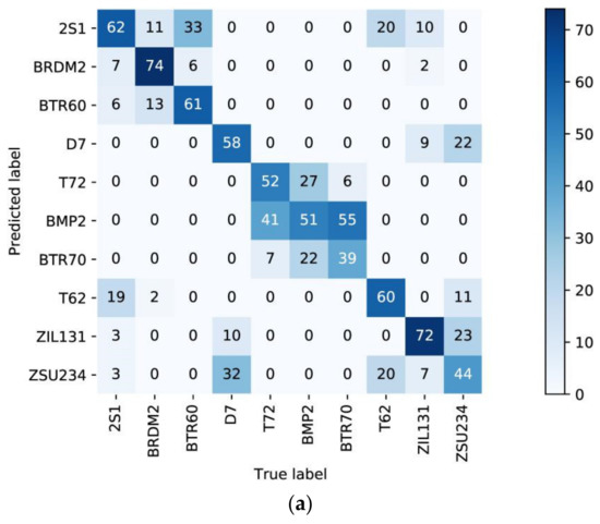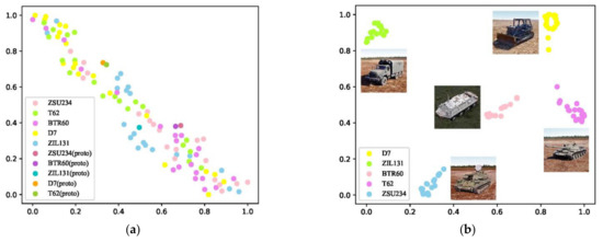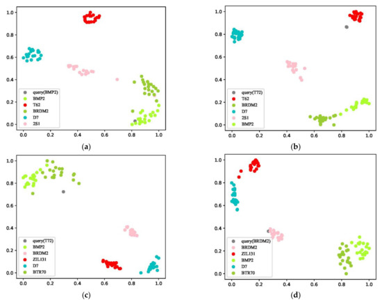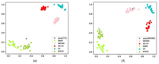 (2) Interpretability: As shown in Figure 6a,b, in a testing task, T62 (tank), D7 (bulldozer), BMP2 (infantry fighting vehicle), BRDM2 (armored reconnaissance vehicle), and 2S1 (self-propelled howitzer) are selected as the . For Figure 6a,b, BMP2 and T72 (tank) are respectively taken as the . It can be seen that BMP2 is well identified, while T72 is well separated from the other categories (i.e., identified as unseen). By distance comparison, T72 and T62 are visually similar. As shown in Figure 6c,d, in another testing task, five categories of D7, BRDM2, BMP2, BTR70 (armored transport vehicle), and ZIL131 (freight truck) are selected as , T72 and BRDM2 are used as for Figure 6c,d, respectively. It can be seen that BRDM2 is well identified, and T72 is well separated from the other categories, as before. From the distance comparison, it can be seen that T72 is similar to BMP2 and BTR70 in these five categories, which is also in line with reality. It can be seen from Figure 6e,f that different samples of the same category as input will not cause significant changes in the distance between categories. The above can prove the proposed method has an excellent and stable ability to interpret.