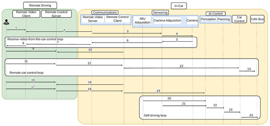 The sequence diagram is based on three main loops: the first one is in charge of receiving video from the car loop; the second one allows the remote control of the car; and the third one is the loop in which the AI takes control of the car. The video-receiving loop is always working; however, the remote control loop and the self-driving loop are mutually exclusive, i.e., when one of them is operating, the other one is not.