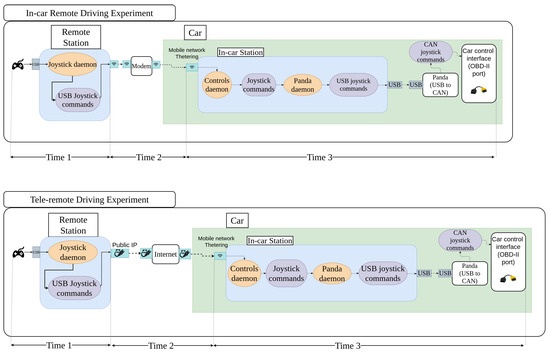 For both of the experiments, the results related to the delays present in the joystick commands and the video stream delivery were studied: in both of them, the technologies used were the same. For video streaming, a video module, using the Real-time Media Protocol (RTMP) in an NGINX server, was installed. The server was then virtualized in a docker container. After the virtualization, the in-car system started sending video to the server, using FFMPEG. The video was requested by the remote station system, using FFMPLAY.