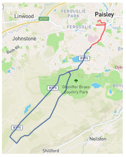Both experiments were carried out in a 2019 Toyota Prius Hybrid. The chosen route for the experiments was 14 miles long, and ran from the University of the West of Scotland facilities in Paisley (UK) to the city’s outskirts, mixing urban, secondary roads, and a highway: this way, we could experience how the system reacted when there was a good connection (urban areas) or a poorer connection (secondary roads). The scheme for the route can be seen in