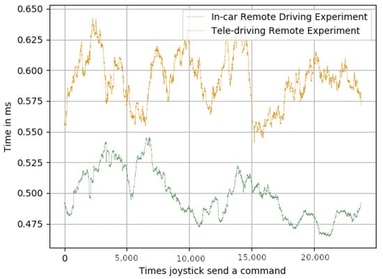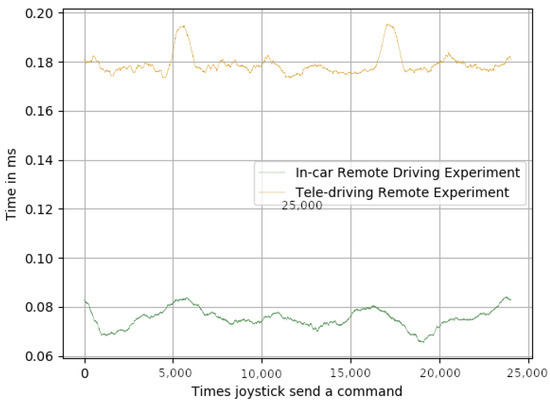 Table 2 shows that the average delay for the in-car remote driving experiment was 25.39 ms, and for the tele-driving, it was 31.78 ms. These results clearly validate their suitability for achieving real-time control of the car, as the delays were very reasonable response times. It is also important to note that the standard deviations of the average means kept the variability of the average always within the real-time boundaries, which also meant that the impact on the framework performance, when switching from AI control to remote control, was minimal and not noticeable.