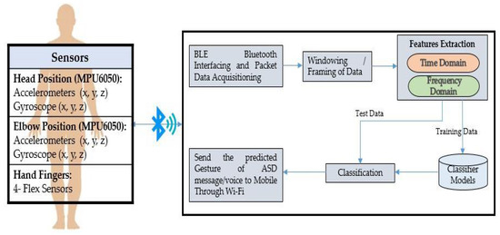 Section 2 briefly introduces the related works and the background of sensors, IoT, and machine learning techniques about activities and gesture recognition. The proposed methodology for body-worn sensors-based IoT platform for ASD children’s gestures acquisition, feature extraction, and recognition algorithms is discussed in