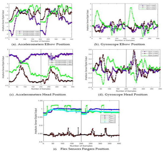 We acquired and built a dataset of ten complex gestures of ASD children’s sign language, performed twenty times each using the designed flex sensors glove, accelerometers, and gyroscope placed at hand and head position.