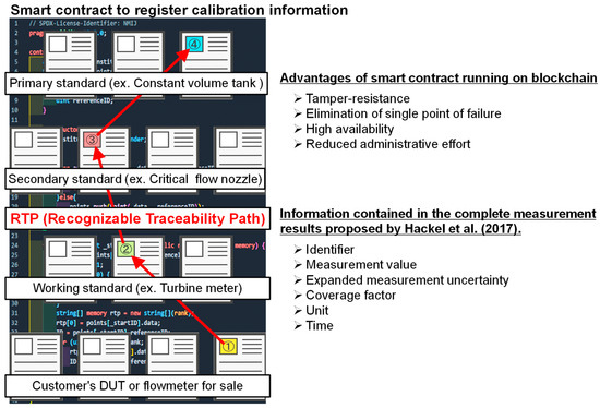 The data recording on a blockchain is expected to improve the reliability and added value of the measurement system, as exemplified by the traceability management and visualization system (i.e., the RTP) proposed in this study. Therefore, companies and research institutions should conduct a cost–benefit analysis before recording data on a blockchain. Blockchain usage may be appropriate for valuable data with high calibration costs (e.g., flow meter calibrations with large bore under high flow rates and calibration of cryogenic thermometers) because of the need to pay transaction fees at the time of using a public chain (Ethereum). Moreover, important standards that are frequently referenced, such as national and primary standards, would also be worth registering on the blockchain. If the transaction fee is an issue in the use of blockchain, utilizing a private chain such as HF rather than a public chain such as Ethereum would reduce costs. However, tamper resistance and other factors need to be considered when using a private chain. On public chains, practical applications for lowering transaction fees are also underway. For instance, Layer2 technologies such as Lightning Network [55,56] and proof-of-stake [57,58] alternatives to proof-of-work [59] are being developed.