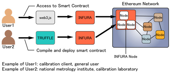 There are many methods for deploying and using smart contracts written in Solidity on the Ethereum network. One method is to use Go Ethereum (Geth), a node operation software developed by the Ethereum Foundation, and another method is to use an integrated development environment called Remix, which allows the creation, compilation, and deployment of smart contracts in a web browser. Unlike the above methods, this study implements and uses smart contracts, employing Truffle, INFURA, and web3.js, which are relatively easy and highly flexible. Truffle is the de facto standard framework for Ethereum application development and can compile and deploy smart contracts. INFURA, an Ethereum node hosting service, makes it possible to connect to the Ethereum network without downloading Ethereum nodes such as Geth. web3.js is a JavaScript library and can be used to access deployed smart contracts. Figure 2 illustrates these relationships.