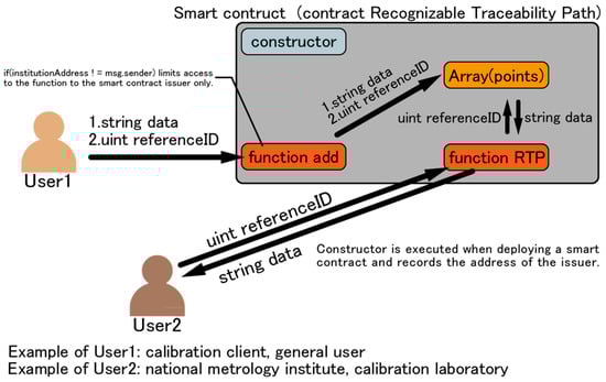 An overview and program of a simple smart contract on the RTP are depicted in Figure 3 and Algorithm 1. There are two types of functions in Algorithm 1. One is “function add” that records data such as a DUT or reference standard in the Ethereum blockchain, and the other is “function RTP” that references the RTP from a DUT to a primary standard. “constructor()” is executed when a smart contract is deployed and records the address of the smart contract issuer. This grants access to “function add”, which is described next only to the smart contract issuer. This is necessary to resolve user authentication issues such as verifying the identity of national metrology institutes and calibration laboratories.
