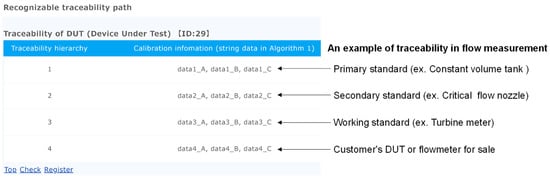 In this study, calibration clients and end users are assumed as User 1 using “function RTP”, and national metrology institutes and accredited calibration laboratories are assumed as User 2 using “function add”. An example of RTP information received by User 1 is depicted in Figure 4, revealing the actual acquisition of pre-registered data from Ropsten (Ethereum’s test network) by a local server built on node.js through web3.js and INFURA. The calibration information in Figure 4 corresponds to “string data” in Algorithm 1, and the data are stored in each traceability hierarchy. Information registered on Ropsten using Algorithm 1 is obtained through web3.js and INFURA and reflected in node.js. Traceability hierarchy 1 describes the calibration information on a primary standard, and 4 describes the calibration information on a DUT.