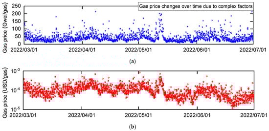 Time variation in gas price on Ethereum’s main network. The transaction fee is determined by the gas price and gas usage. Gas prices change over time due to various factors. Gas usage depends on the throughput of smart contracts (type and number of opcodes executed). (a) Gas price (Gwei/gas). (b) Gas price (USD/gas).