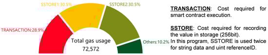 The results of the validation reveal that when “string data” and “uint referenceID” are recorded on Ropsten in Algorithm 1, the gas usage is 72,572. The two opcodes with the highest gas costs are TRANSACTION and SSTORE, as depicted in Figure 6. TRANSACTION consumes 21,000 gas as the minimum cost of issuing a transaction. SSTORE consumes 22,100 gas as the cost of recording data (cold access) on each Ethereum node. In the program described here, SSTORE is used twice because two data, “string data” and “uint referenceID”, are recorded (44,200 gas). TRANSACTION and two SSTOREs account for approximately 90% of the total gas usage of 72,572 gas. This ratio is similar when the number of variables (number of “string data”) increases. From this, it is possible to estimate the overall gas usage from the number of times SSTORE are used, i.e., the number of variables. Note that recording more than 256 bits of data in “string data” may cause the gas usage to fluctuate.