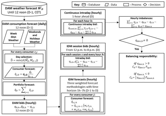 - Retailers compute the consumption forecast, , for bidding at each session, s, of the IDM, by considering a procedure that considers the meteorological conditions, the bids submitted to the DAM, , the growth-rate method for a short-run period of 1 to 7 h, , and the average consumption behaviour of each consumer between adjacent time periods, :where j denotes a specific consumer and J the total number of consumers. For time period, h, this formula considers the real consumption of the previous time period, if it exists, or its forecast, , and also the weight, w, of a particular method from a set of three methods. One method considers the bids submitted to the DAM, and , at time periods and h, respectively:Another method considers the traditional behaviour of each consumer (obtained by analyzing the historical consumption data):The last method considers the traditional behaviour and the last consumption tendency (to increase/decrease) of each consumer:
