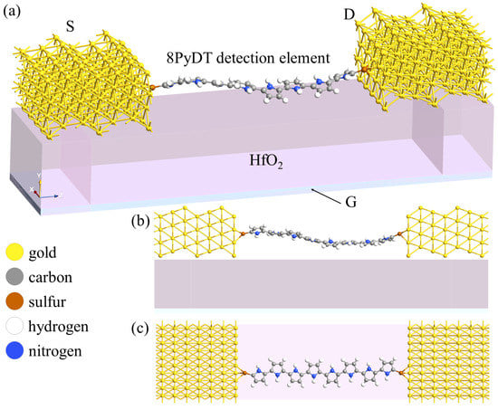 (a) 3D view of the structure of the proposed Au-8PyDT MolFET SMS; (b) side view; (c) top view.