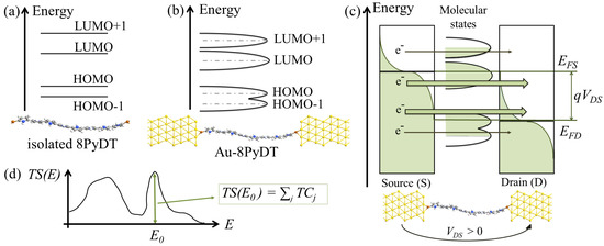 When the channel molecule, namely, the 8PyDT, is isolated, it exhibits its quantum mechanical nature through different discrete energy levels. Figure 2a shows the molecular energy levels close to the Fermi level, which are the most significant for transport, i.e., the Highest Occupied Molecular Orbital (HOMO), the HOMO-1, the Lowest Unoccupied Molecular Orbital (LUMO) and the LUMO+1. Thanks to the strong covalent bonds possible between gold and sulfur, the 8PyDT exhibits both a broadening and a shift in its energy levels when it is anchored to the S and D electrodes [], see Figure 2b. Indeed, the Fermi level alignment occurring at thermodynamic equilibrium in the system composed of the 8PyDT and the S and D contacts produces a shift in the 8PyDT energy levels. Moreover, the chemical bond between thiol and gold contacts also facilitates electron movement between the 8PyDT and the S and D electrodes. Thus, electron states are no longer confined to steady states with infinite lifetimes. Instead, they are delocalized states with a finite lifetime, named intrinsic time (), comparable to the average time required to move an electron from/to the molecule to/from the contacts. The intrinsic time is related to the energy broadening () through a time-energy uncertainty-like relation, , where h is Planck’s constant. Note that the lower the energy broadening, the larger the intrinsic time, i.e., the time the electrons spend in the molecular 8PyDT quantum dot on average. The limit case in which there is no uncertainty on the energy level value, i.e., , corresponds to infinite intrinsic time (no electron travel from/to the molecule to/from the contacts). occurs when the molecule 8PyDT is isolated, i.e., electrons are in their quantum steady states for an infinite time with no possibility of escaping the system.