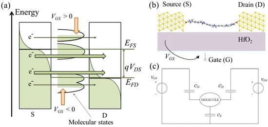 In MolFETs with solid-state gate electrodes, the gate terminal defines the electrostatics of the system through the applied gate voltage, . The stack material, the spatial placement and the arrangement of the gate do not directly influence the chemical structure of the molecular junction nor the molecular channel transmission states contributing to conduction. Instead, they significantly determine the electrostatic control of the electrons flowing across the molecular channel, thus the effectiveness of the gate potential in the current modulation during MolFET switching. The basic working principle of MolFET relies on the gating effect discussed in the following. The gating effect is the main effect of applying a gate voltage, , to the molecular junction. It consists of the upwards and downwards shift in the energy of the molecular energy states in the [], as depicted in Figure 3a. This shift consequently causes a modulation of the current, , because of the entrance or exiting of molecular energy states that can contribute to electronic conduction. In particular, when a positive gate voltage ( > 0) is applied, the molecular states are shifted downwards in energy, whereas when a negative gate voltage is applied ( < 0), they are shifted upwards in energy. This gate-induced shift permits molecular states to enter or leave the , thus deciding their contribution to the electronic transmission. Quantitatively, the energy shift is due to the applied and depends on the effectiveness of the gate potential energy, , on the electrostatic control of the channel molecular states. Using the capacitive equivalent model of the MolFET proposed in [] and shown in Figure 3c, the gate effectiveness is defined through as: