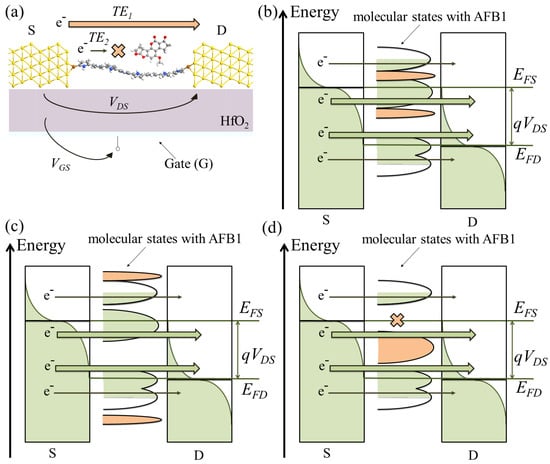 In addition, we explained in Section 2.1 that the S to D transmission mainly occurs in the energy range referred to as , i.e., in between and . Modifications of and can be included, partially included or not included in the , see Figure 4, leading to a voltage-dependent sensor response. Moreover, the current, , is directly proportional to the integral of , Equation (1). Thus, the modifications of can compensate for each other in the in terms of current. For example, Figure 4d shows the case where there is an increase in at a given energy (E) cancelled by a decrease in at another E. No significant modulation occurs because of the compensation of the two effects.