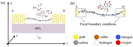 Finally, the proposed MolFET-based SMS comprises the gold-8PyDT-gold molecular junction (Au-8PyDT) and an additional G electrode. The G electrode is electrostatically coupled to the structure through a Å-thick HfO2 (relative dielectric permittivity 25), corresponding to two atomic layers (c direction, Baddeleyite structure in the monoclinic P21/c space group), achievable with Atomic Deposition Layer (ALD) fabrication processes [,].
