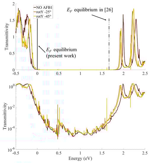 Figure 6 reports the equilibrium (i.e., = 0 V and = 0 V) function for the SMS either without aflatoxin or in the presence of AFB1 in both rotY and rotY configurations. For clarity, the figure reports linear (top) and semi-logarithmic (bottom) scales. Note that the energy reference is chosen so that the system Fermi level, , at equilibrium is 0 eV. Interestingly, a shift is present if comparing the obtained with our previous work []. In the present work, we find an close to the peak corresponding to the HOMO molecular level (low energy, left side), while in our previous work [], was closer to the LUMO peak (high energy, right side). We relate this difference to the different S and D electrodes in the two works. The number of atoms and the orientation of the gold electrodes is the same in the two works (Face Centered Cubic (111) for both S and D). Nevertheless, in [], we did not use the G electrode and we used periodic boundary conditions to model the electrode extension in all directions, including in the vertical direction. Instead, in the present work, we considered a gate electrode and we enforced Neumann and Dirichlet boundary conditions in the vertical direction to correctly model it. This corresponds to model broad and thin S and D electrodes, as it is the case when a gate is present in the structure (refer to Figure 1). Therefore, the considered S and D electrodes are very different from the ones in [] and their Fermi levels are affected and shifted in energy. Consequently, when the equilibrium condition is reached through a charge (electron) redistribution in the system, the Fermi level alignment occurs at a different energy; the relative positions of the (broadened) HOMO and LUMO states of the molecular channel with respect to are varied. As a result, while in [] the transport was mainly of LUMO-type, i.e., mediated by the LUMO peak, in the present study, the transport is naturally mediated by the HOMO peak. Nevertheless, as explained in Section 2.2, with a suitable it is possible to shift in energy and recover the LUMO-mediated transmission.