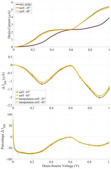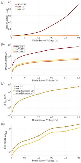 Figure 9 reports the in linear (a) and semilogarithmic (b) scales and the and for a gate voltage fixed at V. The performance improvement produced by the presence of the is enormous. Indeed, in the range, the with AFB1 in both the rotY and rotY configurations is two orders of magnitude lower than the obtained with the SMS without AFB1. The values obtained without AFB1 are on the order of fraction of A, making them detectable with conventional current-to-frequency converters or other well-established amperometric detection techniques. On the other hand, the values obtained with AFB1 are on the order of nA, making them clearly distinguishable from the previous one and robust to noise. From the analysis, Figure 9c, at low bias (e.g., V) there is a reduction of around two orders of magnitude in . We identify V as a possible working point for the amperometric detection of AFB1 through the studied SMS, with the advantage of having a large and also stable sensor response with operating variations due to, e.g., supply noise or biasing circuit non-idealities. The percentage current variation, Figure 9d, is always above 1000%, and it overcomes 10,000% for a close to 0.5 V.