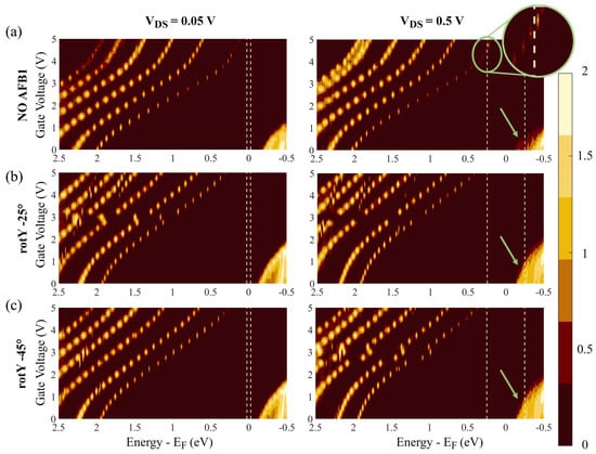 Equation (1) states that the current is related to the through Landauer’s integral. Thus, a significant current variation caused by AFB1 is obtained if its presence modulates the within the . Starting with the knowledge of the most stable adsorption configurations from Section 4.1, we calculated the and with AFB1 in the rotY and rotY configurations and we compared it with the obtained without AFB1. In general, depends on and , which should be considered together. We chose the that maximizes the differences in the portion included in the in the case in which AFB1 is present with respect to the case without AFB1. The chosen optimal was the gate voltage that maximizes the sensor current modulation and thus its sensitivity to AFB1.