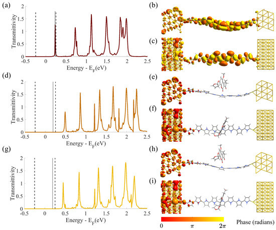 Computed transmission spectra of the Au-8PyDT FET sensor for = 4.75 V and = 0.5 V without (a) and with the AFB1 target, with an x-rotation of 25 (d) and 45 (g). The dashed black lines represent the . The solid black lines show the energy values of the transmission peak included within the BW with the highest transmittivity (the transmission peaks in the cases with AFB1 are not visible on the linear scale). For these energy values (0.23 eV, 0.19 eV and 0.19 eV, respectively), the transmission eigenstates, s, with the highest transmission coefficient, , were computed and shown with the same isovalue (0.25) without AFB1 in front (b) and top (c) views (TC = 0.74), with AFB1 and x-rotation of 25 in front (e) and top (f) views (TC = 0.0004) and with AFB1 and x-rotation of 45 in front (h) and top (i) views (TC = 0.0005).