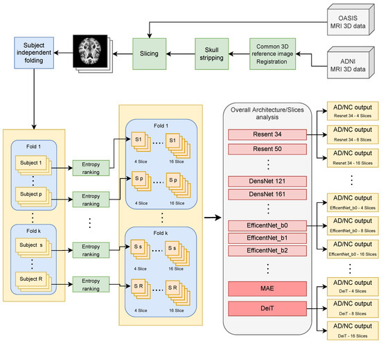 Experiments were performed on two large, publicly available datasets and showed a significant improvement in subject-level classification compared to the leading approaches in the state of the art. Furthermore, for each CNN and ViT approach, an evaluation was performed on several benchmarks to assess knowledge extraction and generalization capabilities when the number of slices per subject changes (4, 8, and 16 slices were considered). To allow a fair comparison of classification methods (which is the goal of this paper), 3D volume registration and 2D slice extraction were performed using the same approaches as comparative works in the literature. Noise-related reliability introduced by MRI acquisition with various scanning devices is beyond the scope of this paper. In this regard, the reader may refer to several papers addressing the role of entropy in brain MRI data [35,36], and the effectiveness of 3D data registration [37]. The remainder of the paper is organized as follows: Section 2 describes materials and methods, while Section 3 reports experimental results. Finally, Section 4 concludes the paper.
