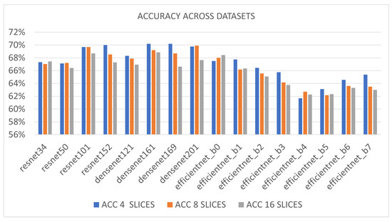 The ResNet152, DenseNet161 and DenseNet169 models gathered the best scores (a few more than 70%) when 4 slices per subject were extracted (blue vertical bars). In the case of 8 slices per subject (orange vertical bars), the model that experienced the best accuracy clearly was the DenseNet201 model (mean accuracy almost 70%) whereas in the case of 16 slices per subject (grey vertical bars), the most accurate model was the DenseNet161 (mean accuracy more than 69%). Overall, all the DenseNet models provided satisfying outcomes in all three experimental cases (average accuracy across experiments and models 68.68% against EfficientNetand ResNet models reaching 64.69% and 68.03%). Satisfactory results were also reached by using deeper ResNet models and the tightest EfficientNet one. From accuracy results in Table 2, it is possible to understand that, for the considered classification problem, CNN requires representing the information on several levels of extracted features. This can be better achieved by DenseNet architectures, which make use of identity connections on each layer. On the other side, ResNet architectures, which have identity connections limited to blocks (of consecutive levels) work very well too, but they are not able to completely get a representation of the information embedded in the data on different datasets and benchmarks. Finally, it emerged that none of the eight EfficientNet architectures provided excellent classification outcomes. The main reason for this drawback could be the impossibility to transfer the information flow along layers through inverted residual blocks relying on a narrowed number of channels. It might be possible to conclude that this kind of architecture is not suitable for modeling such a complex problem as the classification of brain MRI images.