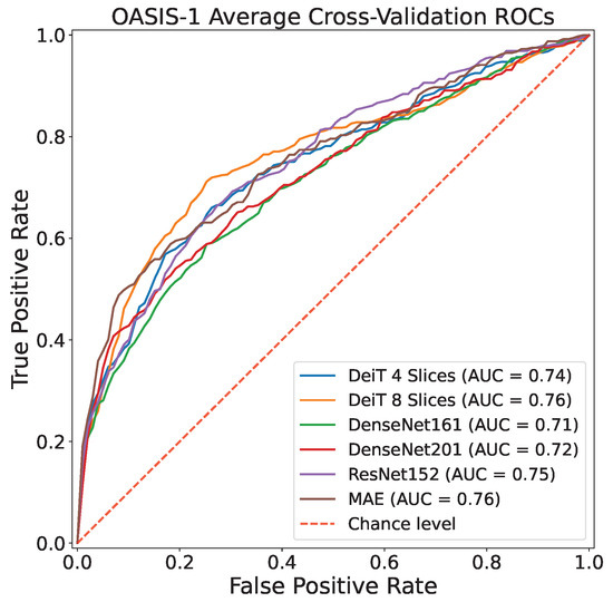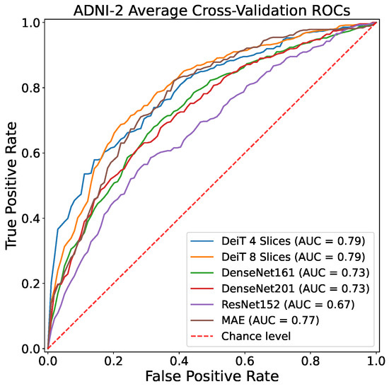 Table 4 clearly indicates the improvement introduced by the CNN models considered in this work with respect to previous approaches proposed in the literature. Results reveal how the tested DL architectures, and especially the visual transformer architectures (DeiT), are the leading in MRI 2D slices classification in the case of no data leakage, making a big step towards actual exploitation of CAD systems in real-life AD diagnosis. This is corroborated also by observing ROC curves reported in Figure 3 and Figure 4.