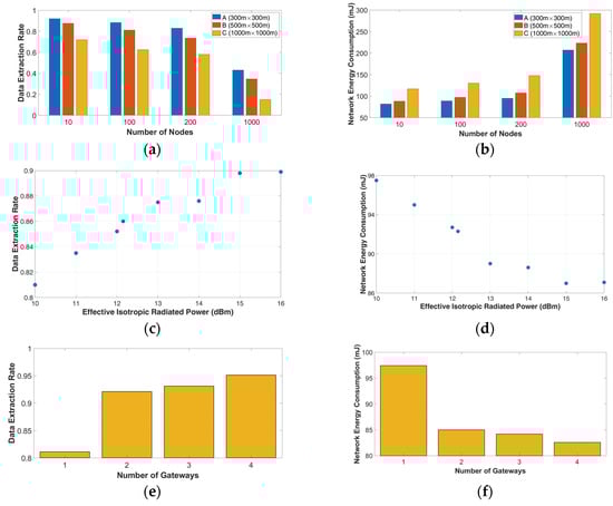 - Transmission power (TP). TP can be set between −4 and 20 dBm. When the TP increases, the energy consumption of the network and the signal-to-noise ratio (SNR) are also increased.