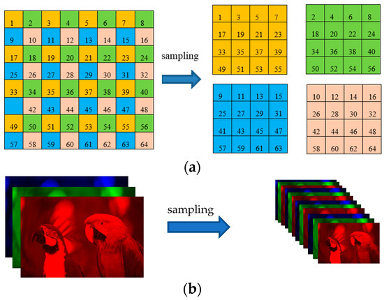 A simple demonstration of the sampling method. (a) An image is sampled to obtain four sub-images; (b) A three-channel RGB image is sampled to form four three-channel sub-images.