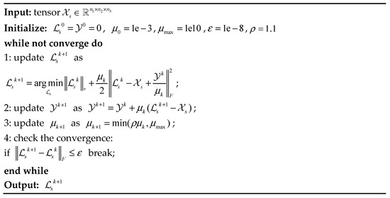 where is the Lagrangian multiplier and is the penalty parameter. We then update by alternately minimizing the augmented Lagrangian function . The sub-problem has a closed-form solution, with the t-SVT operator related to TNN. A pseudo-code description of the entire optimization problem (11) is given in Figure 4.