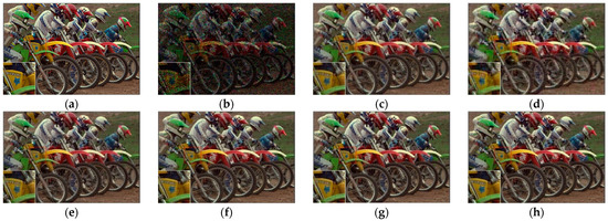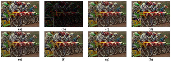 In order to further verify the effectiveness of the proposed algorithm, we additionally used 24 color images from the Kodak PhotoCD dataset (http://r0k.us/graphics/kodak/ (accessed on 3 January 2018)) for testing. The size of each image is . As in the previous test, in order to test the repair effect of various algorithms on the image, we randomly lost 30%, 50%, and 70% of the pixels in each image, and formed an incomplete tensor .