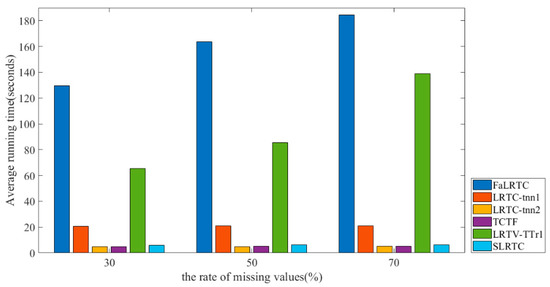At the same time, we also give a comparison of the algorithm complexity of restoring 24 test images with a resolution of 768 × 512, as shown in Figure 11. It can be seen that SLRTC is much faster than the FaLRTC, LRTC-TNN1, and LRTV-TTr1 methods, and is comparable to the TCTF and LRTC-TNN2 methods.
