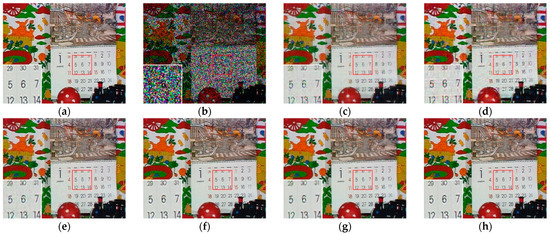 Visual effect comparison of different methods on the ninth frame completion of the Mobile video. The incomplete video contains 50% missing entries. (a) Original image; (b) Incomplete image; (c) FaLRTC (21.51 dB); (d) TCTF (21.80 dB); (e) LRTC-TNN1 (24.12 dB); (f) LRTC-TNN2 (28.09dB); (g) LRTV-TTr1 (26.15 dB); (h) SLRTC (29.97 dB).