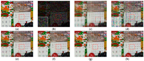 Visual effect comparison of different methods on the ninth frame completion of the Mobile video. The incomplete video contains 80% missing entries. (a) Original image; (b) Incomplete image; (c) FaLRTC (16.46 dB); (d) TCTF (11.53 dB); (e) LRTC-TNN1 (18.69 dB); (f) LRTC-TNN2 (20.67dB); (g) LRTV-TTr1 (19.91 dB); (h) SLRTC (20.87 dB).