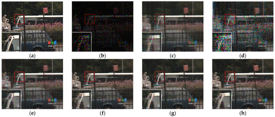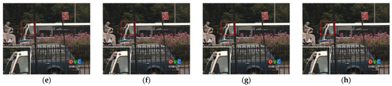 Visual effect comparison of different methods on the ninth frame completion of the Bus video. The incomplete video contains 50% missing entries. (a) Original image; (b) Incomplete image; (c) FaLRTC (27.30 dB); (d) TCTF (26.42 dB); (e) LRTC-TNN1 (29.05 dB); (f) LRTC-TNN2 (32.92 dB); (g) LRTV-TTr1 (31.77 dB); (h) SLRTC (34.34 dB).