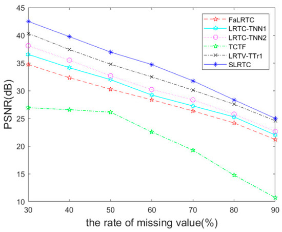 Table 3 and Table 4 are the comparison of PSNR and SSIM when the missing rate is 50% and 70%, respectively. As shown in Table 2, our algorithm can surpass the other algorithms in terms of PSNR, but the SSIM value of image restoration is lower than that of the LRTC-TTr1 method. The reason is mainly due to the sampling process from image to sub-image in the first step of the SLRTC method. Although the sub-image has a stronger low rank than the original image, it weakens the overall structural relevance of the image.