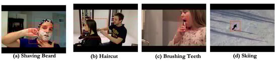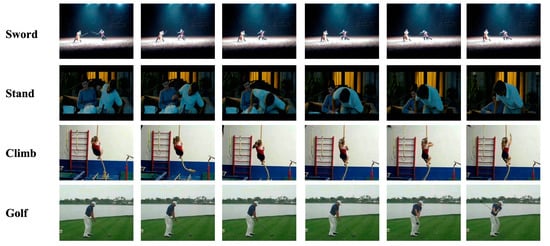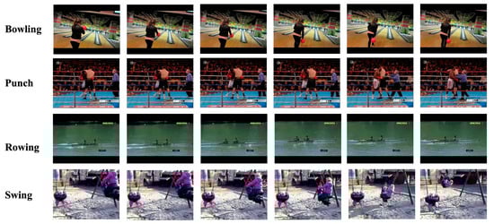 A great number of videos have been generated as a result of the advancement of multimedia technologies. In recent years, video understanding has emerged as a crucial field of computer vision for better analyzing and understanding video data. Human action recognition is one of the most fundamental tasks in video understanding, which is becoming increasingly popular in surveillance systems [], health care systems, social robots [], and other applications. In short, the ultimate goal of human action recognition is to allow machines to understand the action of the subject’s objectives in various observations, such as video frames through the camera sensors. Two important and complementary indications for action recognition in videos are spatial and temporal dynamics. The ability of a recognition system to extract and use useful information from it determines its performance to a considerable extent. However, owing to raw videos including far more redundant or irrelevant information in the space and time domains, extracting such information is tough. For example, in Figure 1, the discriminative part of four instances is just in the red dotted line box, demonstrating that not every part of the subject has a clear discriminatory effect on action recognition. As a result, it is critical to create effective representations to address these issues when learning categorical information about action classes.