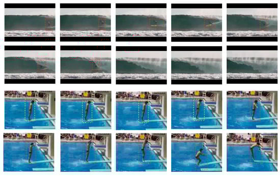 The original video is cut into different video clips, each with different contributions to action recognition. Some clips have a discriminatory role in the classification, while others may lead to the action classifier being misled. For instance, as shown in Figure 2, the figures in the first and the second row are the same action, “Surfing”, but only the first seven frame figures contain the target of the action (marked by the red dotted line in the figure), while the surfer and the surfboard do not appear in the next few frame figures. These figures are irrelevant for recognizing the action. Although each figure in the third and the fourth row contains the action subject, the motion information of the several frames marked in the red box is not obvious. These figures appear in many actions of the same dataset, such as “Archery”, “Playing Flute”, “Swing”, “Jetski” and so on, which are not discriminative when it comes to recognizing action. When the action classifier averages the predictions from all figures, these irrelevant and non-discriminating figures deceive it. Previous approaches required pre-processing of input videos to remove irrelevant and non-discriminating figures. However, because pre-processing is normally performed by hand, it is not only time-consuming, but also requires significant financial resources in real-world applications.