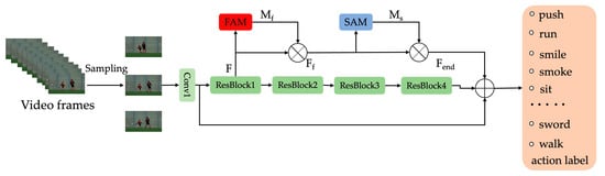 In this section, we make a detailed description of the proposed FSAN. Figure 4 depicts the general structure of our model. In particular, it is noted that the ResBlock in Figure 4 is based on the s-resnet in Figure 3. We embed our proposed attention module on the last three residual blocks of the s-resnet. For convenience, we give a demonstration of only one ResBlock-connected attention module in Figure 4. In both the spatial and temporal dimensions, video often provides discriminating information for action recognition. However, the distribution of the identity data is frequently uneven. Not every component of the frame is directly connected to the activity in the spatial realm. For instance, in the action of hitting a box with a stick, the box and the stick should have more discriminatory information than the other pieces. Different frames do not convey an equal amount of information in the temporal domain. The video’s fewest frames include the most discriminating action recognition data. For instance, a golf swing is more discriminating than picking up the club. As a result, it is only normal to pay varying amounts of attention to various areas of the film. These discoveries led us to develop a frame and spatial attention module that can determine which portion of the video is more crucial.