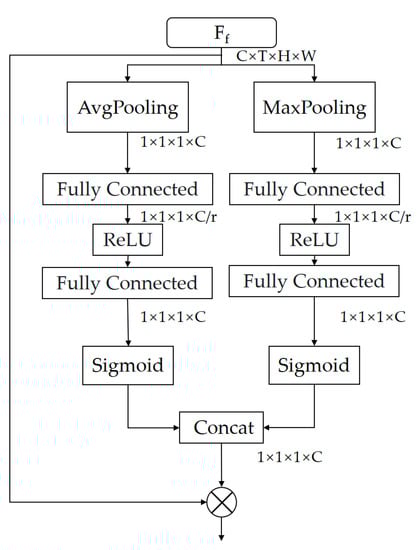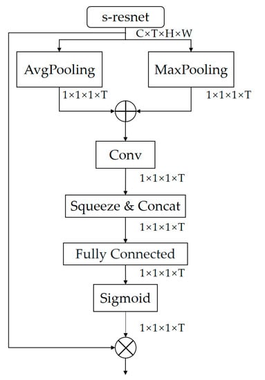 As shown in Figure 5. We obtain the output feature map of the s-resnet, mapping the original input feature map to . The initial features mapping is extracted to the s-resnet for spurious-3d convolution calculation and then fed to the video frame attention. This generated two distinct time feature descriptors, and , to represent the attention weights of the video frames. We concurrently compress the channel and spatial dimensions using AvgPool3d and MaxPool3d. The original features are then passed via the frame attention module to yield the frame attention map and . The complete operation is as follows:
